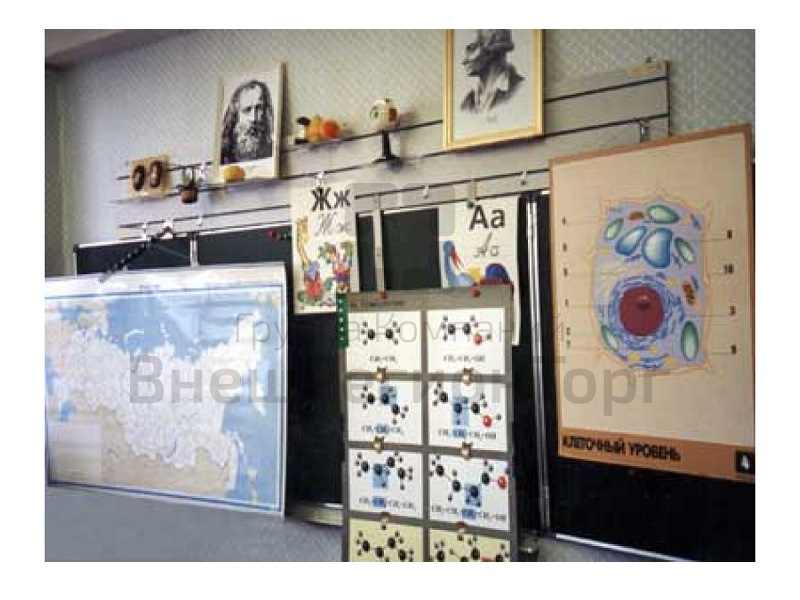 Панель демонстрационная над классной доской предназначена для вывешивания наглядных учебных пособий (карт, таблиц, моделей и др.), необходимых для проведения урока. Представляет собой комплект из двух ламинированных панелей размером 1200х300 мм, в каждой из которых имеются три паза для крепления аксессуаров: набора полок, крюков, магнитных держателей и кронштейна. Аксессуары вставляются в пазы и размещаются на панели в удобном для демонстрировании месте. Каждая ламинированная панель снабжена петлями для крепления ее на стене.