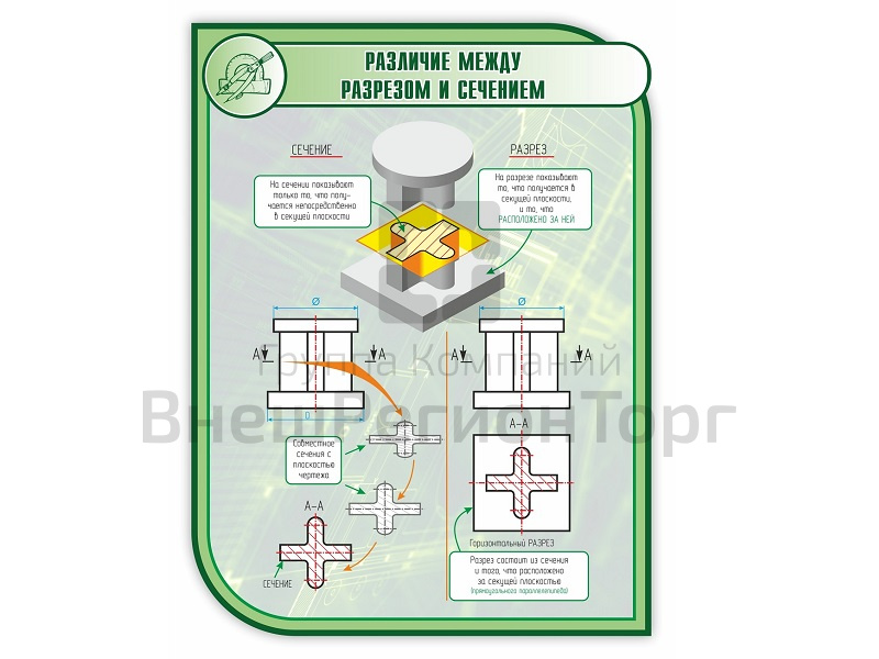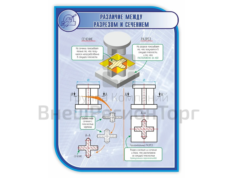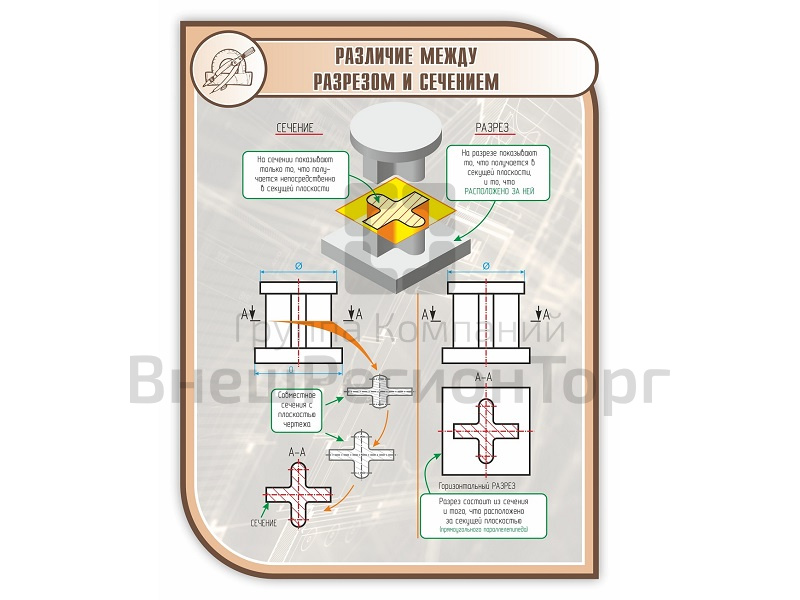 Подробное описание Стенд РАЗЛИЧИЕ МЕЖДУ РАЗРЕЗОМ И СЕЧЕНИЕМ 1*0,75м (скругл.углы)