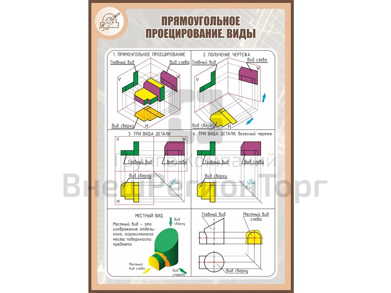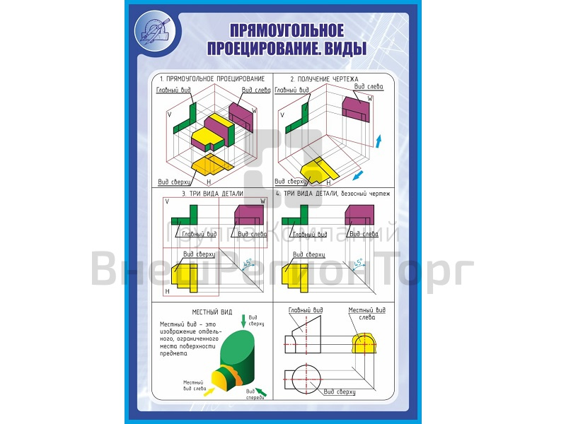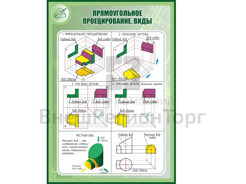 Подробное описание Стенд ПРЯМОУГОЛЬНОЕ ПРОЕЦИРОВАНИЕ. ВИДЫ 1*0,7м