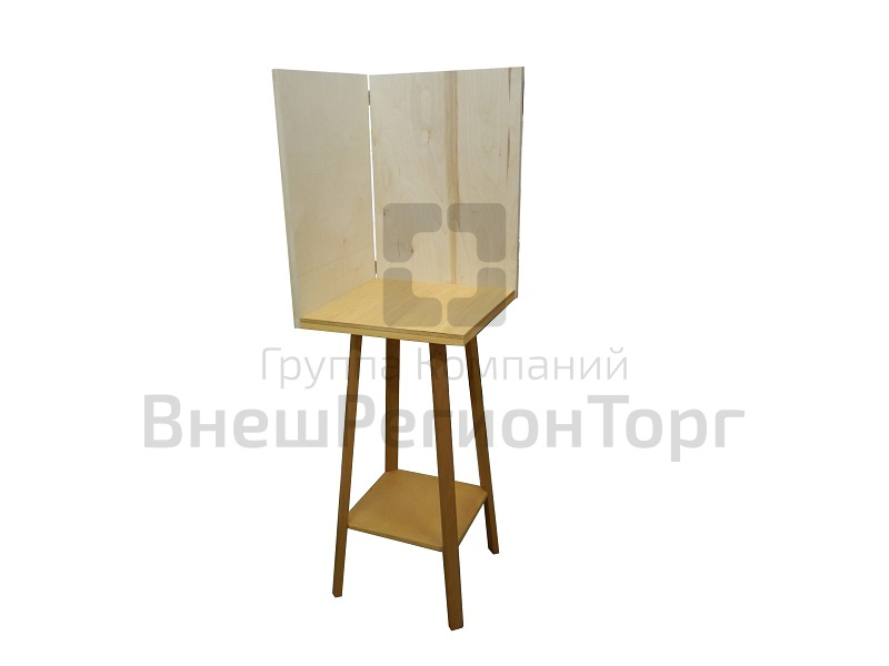 Стол с высокими ножками, расположенными под небольшим углом для большей устойчивости. Крышка оборудована бортиками для драпировки в виде двух перпендикулярных планшетов. Планшеты легко снимаются для переноски и транспортировки.