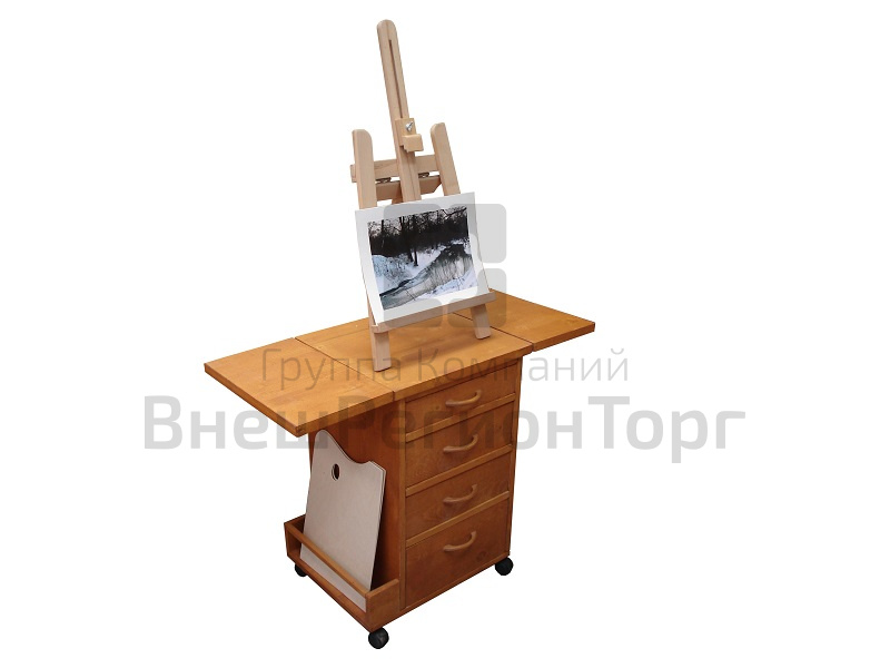 Тумбочка с 4-мя выдвижными ящиками для хранения красок, кистей, палитр, мастихинов и прочих аксессуаров художественного творчества с откидными дополнительными плоскостями и карманом для хранения больших палитр и бутылочных растворителей.