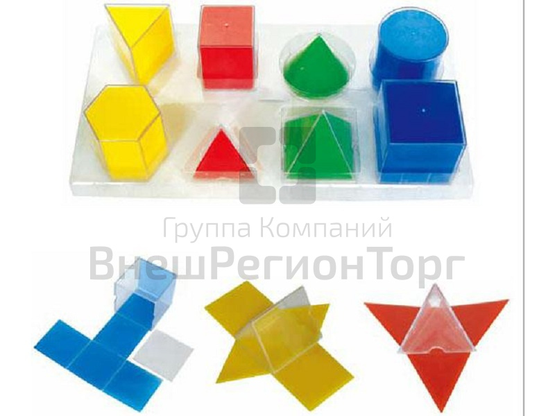 Набор представляет собой объемные фигуры различной геометрической формы изготовленные из прозрачной пластмассы, основание съемное. Каждое геометрическое тело укомплектовано разверткой (цветная пластмасса), позволяющей наглядно продемонстрировать проекцию геометрического тела на плоскость.