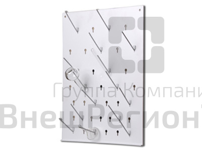 Доска представляет собой пластмассовую панель с 37 отверстиями, в которые вставляются пластиковые держатели для посуды (крючки). Для крепления на стене доска имеет два отверстия, также в комплекте предусмотрены шурупы, дюбели и запасные крючки.
