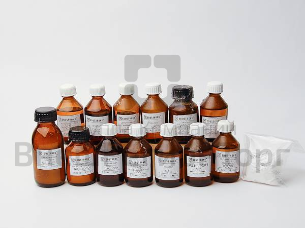 Состав набора (кг.): Анилин - 0,05. Анилин гидрохлорид (солянокислый) - 0,05. Ацетон - 0,05. Бензол - 0,05. Кислота аминоуксусная (глицин) - 0,05. Кислота олеиновая - 0,05. Кислота стеариновая - 0,05. Сахароза - 0,05. Метилен хлористый (дихлорметан) - 0,05. Изоамиловый спирт (изопентанол) - 0,05. Бутиловый спирт - 0,05. Изобутиловый спирт (изобутанол) - 0,05. Тетрахлорметан (углерод четереххлористый) - 0,05. Ксилол - 0,05.