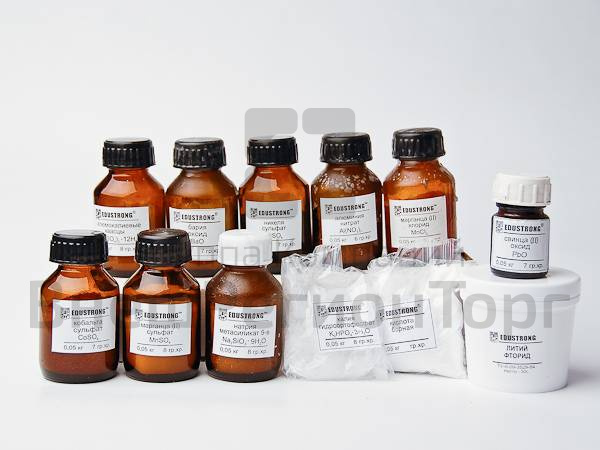 Состав набор (кг): Алюминий азотнокислый "ч" - 0,05. Бария окись "ч" - 0,05. Алюмокалиевые квасцы "ч" - 0,05. Калий фосфорнокислый двухзамещенный "ч" - 0,05. Кобальт (II) сернокислый 7-водный "ч" - 0,05. Кислота борная "ч" - 0,05. Литий фторид - 0,05. Марганец (II) сернокислый 5-водный "ч" - 0,05. Марганец (II) хлористый "ч" - 0,05. Натрий кремнекислый мета 9-водный "ч" - 0,05. Никель сернокислый "ч" - 0,05. Свинец (II) окись "ч" - 0,05.