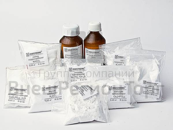 Состав набора (кг): Аммиак водный "ч" - 0,05. Соли углеаммонийные - 0,05. Калий углекислый "ч" или техн. - 0,05. Калий углекислый кислый "ч" - 0,05. Калий фосфорнокислый 2-х замещённый 3-водн "ч" - 0,05. Кальций фосфорнокислый 2-х замещённый "ч" - 0,05. Кальций фосфорнокислый "ч" - 0,05. Кальций фосфорнокислый 1-замещённый 1-водный "ч" - 0,05. Натрий углекислый "ч" - 0,05. Натрий фосфорнокислый 12-водный "ч" - 0,05.