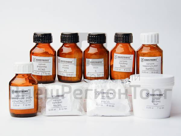 Состав набора (кг): Калий роданистый "ч" - 0,05. Калий йодистый "ч" - 0,05. Калий железисто-синеродистый 3-водный "ч" - 0,05. Натрий углекислый "ч" - 0,05. Натрий бромистый "ч" - 0,05. Натрий сернокислый кислый "ч" - 0,05. Натрий фтористый "ч" - 0,05. Натрий сернокислый "ч" - 0,05. Сера молотая техн. - 0,05.