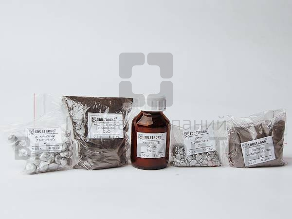 Состав набора (кг): Алюминий гранулированный "ч" - 0,05. Железо (III) окись "ч" - 0,05. Железо металлическое восстановленное "ч" - 0,2. Меди (II) окись "ч" - 0,1. Цинк гранулированный "ч" - 0,1.