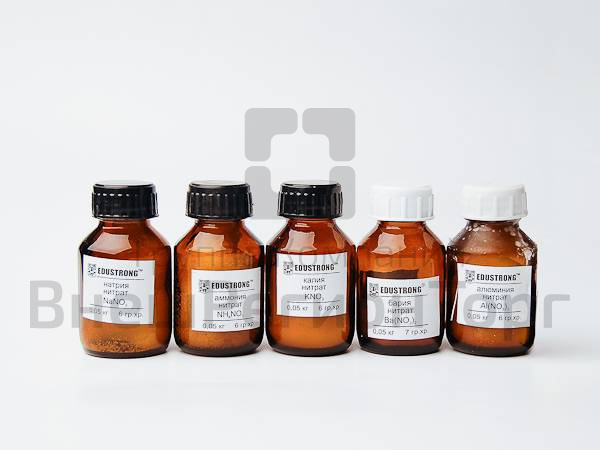 Состав набора (кг): Алюминий азотнокислый 9-водный "ч" - 0,05. Аммоний азотнокислый "ч" - 0,05. Барий азотнокислый "ч" - 0,05. Калий азотнокислый "ч" - 0,05. Натрий азотнокислый "ч" - 0,05.
