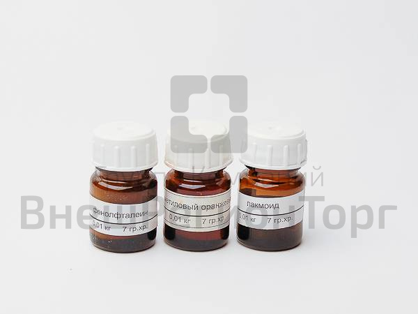 Состав набора (кг): Лакмоид индикатор ч.д.а. - 0,01. Метиловый оранжевый индикатор ч.д.а. - 0,01. Фенолфталеин индикатор ч.д.а. - 0,01.