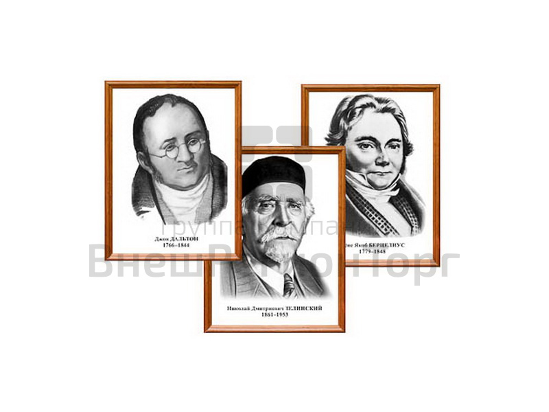 Перечень портретов: 1. Берцелиус Йёнс Якоб. 2. Бутлеров Aлександр Mихайлович. 3. Гей-Люссак Жозеф Луи. 4. Дальтон Джон. 5. Зелинский Николай Дмитриевич. 6. Зинин Николай Николаевич. 7. Лавуазье Антуан Лоран. 8. Менделеев Дмитрий Иванович.