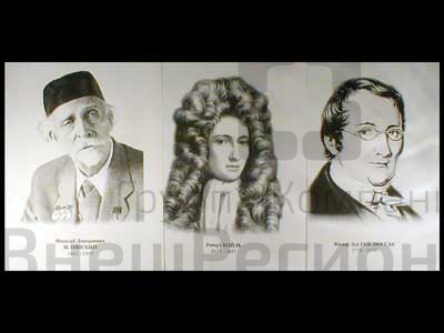 Представляют собой комплект портретов формата А3 в количестве 16 шт., выполненных на качественной белой бумаге. На портретах указаны фамилии (с именами, либо с именами и отчествами) и даты жизни ученых.