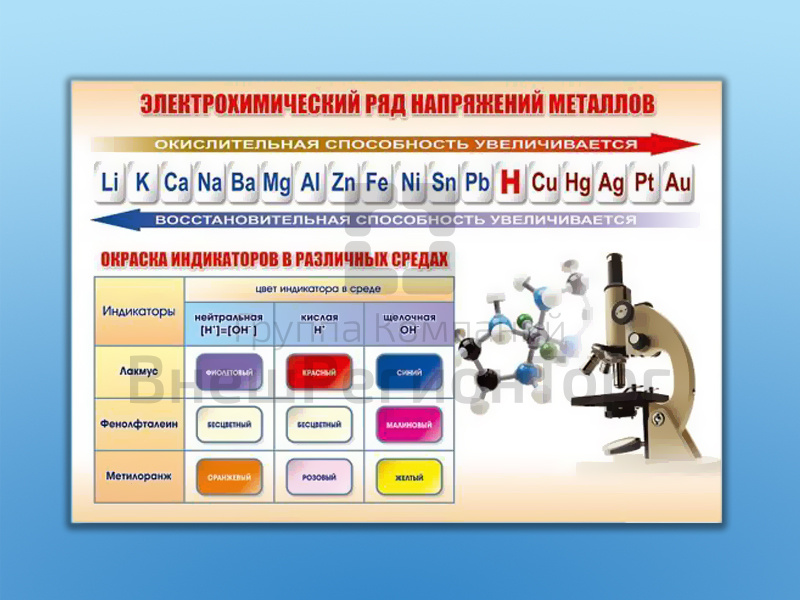 Подробное описание Стенд "Электрохимический ряд и окраска индикаторов в различных средах"