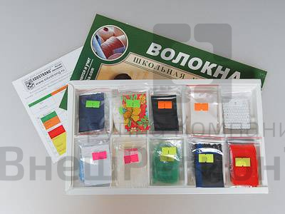 Коллекция включает образцы волокон и изготовленных из них тканей. Образцы разложены в пакетики с наклейками. Цвет наклейки обозначает тип волокна, а номер – его название. Пособие комплектуется руководством по эксплуатации и ламинированным вкладышем, содержащим классификацию волокон, информацию об их свойствах, производстве и применении.