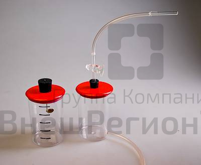 Прибор состоит из двух прозрачных пластиковых стаканов (объем 0,7 л), снабженных герметичными крышками. Стаканы соединяются трубкой ПВХ. В крышку одного стакана вставляется пробка с ложкой для сжигания вещества, в крышку другого – пробка с краном одноходовым, от которого отходит газоотводная трубка со стеклянным мундштуком. На корпус первого стакана нанесены метки, делящие его объем на 6 частей (метки предназначены для определения процента содержания кислорода в воздухе).