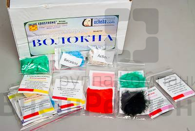 Коллекция включает образцы волокон и изготовленных из них тканей. Образцы разложены в пакеты с этикетками, содержащими название образца, тип волокна и краткую информацию о его свойствах, получении и применении. Также коллекция включает образцы волокон (расфасованы в маленькие пакетики с этикетками), предназначенные для расходования при проведении опытов по идентификации волокон и определении их свойств. Пособие комплектуется руководством по эксплуатации и ламинированным вкладышем, содержащим классификацию волокон, информацию об их свойствах, производстве и применении.