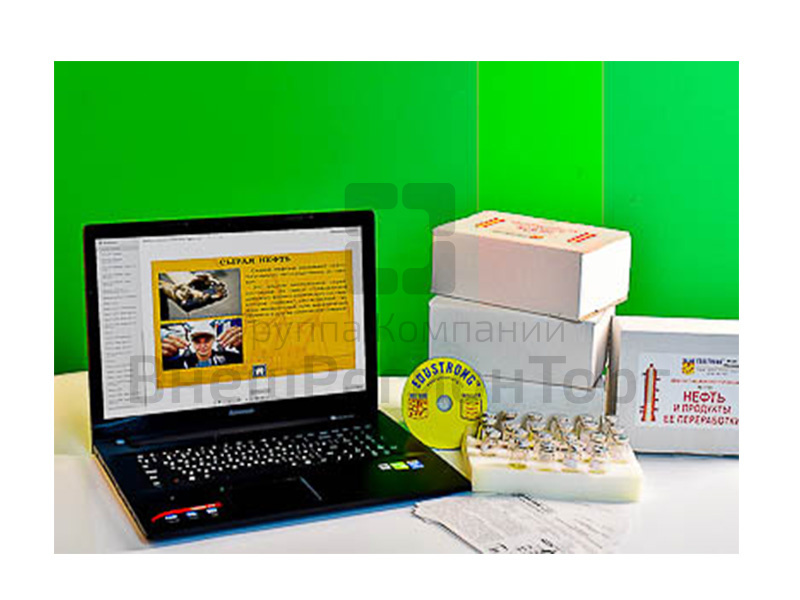 Образцы расфасованы в стеклянные пузырьки с пробкой и обжимной крышкой и полиэтиленовые пакетики. Пузырьки и пакетики пронумерованы и упакованы в коробку с ячейками. Горючие, взрывчатые и ядовитые вещества имитированы. Комплектуются ламинированным вкладышем с информацией о свойствах, перегонке и применении продуктов переработки нефти.