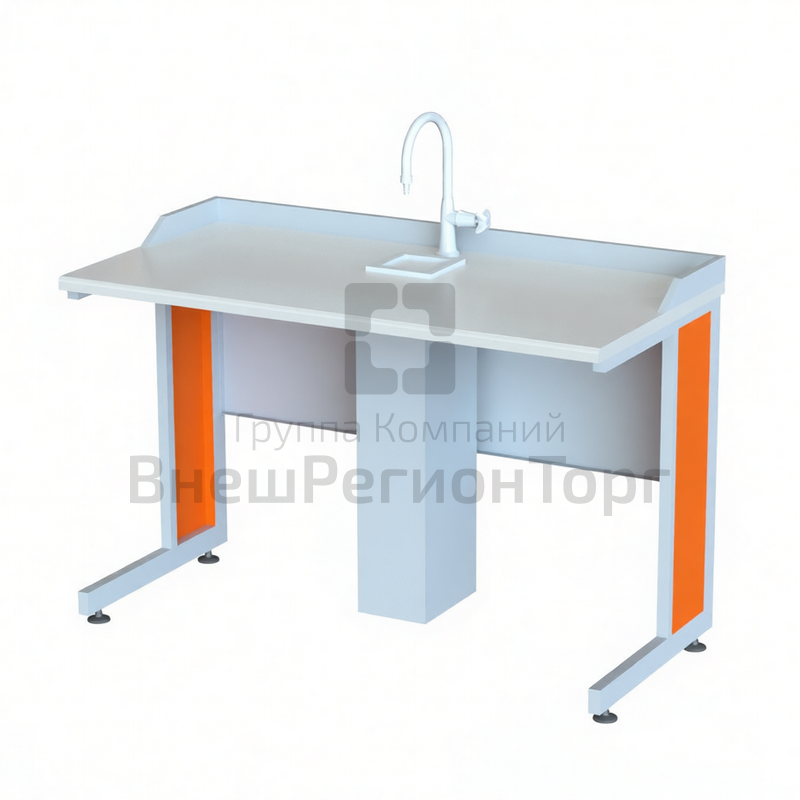 Кран хром, Мойка сливная лабораторная из полипропилена (внутр разм. 100х100х100 мм). Столешница - постформинг толщиной 26 мм. Бортик ЛДСП. Сборно-разборный усиленный металлический каркас. Регулируемые опоры с ходом регулировки до 10-15 мм.
