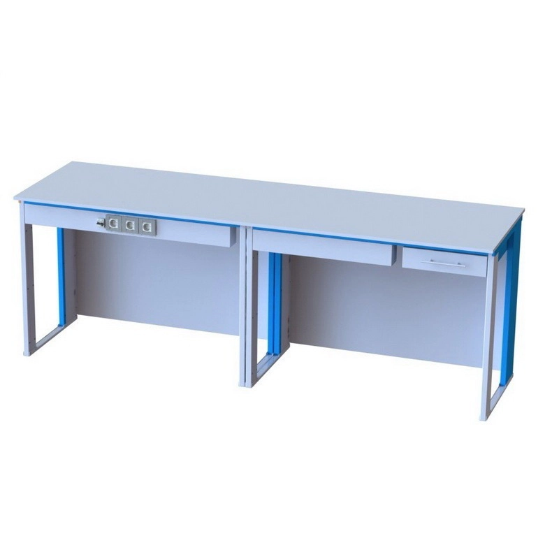 На передней части панели стола демонстрационного расположен электрический блок розеток 220 вольт, автомат аварийного отключения, выдвижной ящик. Возможна комплектация лабораторным краном и мойкой, навесными, встраиваемыми или подкатными тумбами, понижающим трансформатором на 42В и розетками на 42В.
