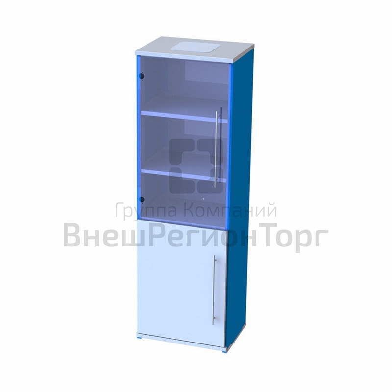 Размер: 600х450х1900 мм. 1 стеклянная дверца сверху, 1 дверца снизу.