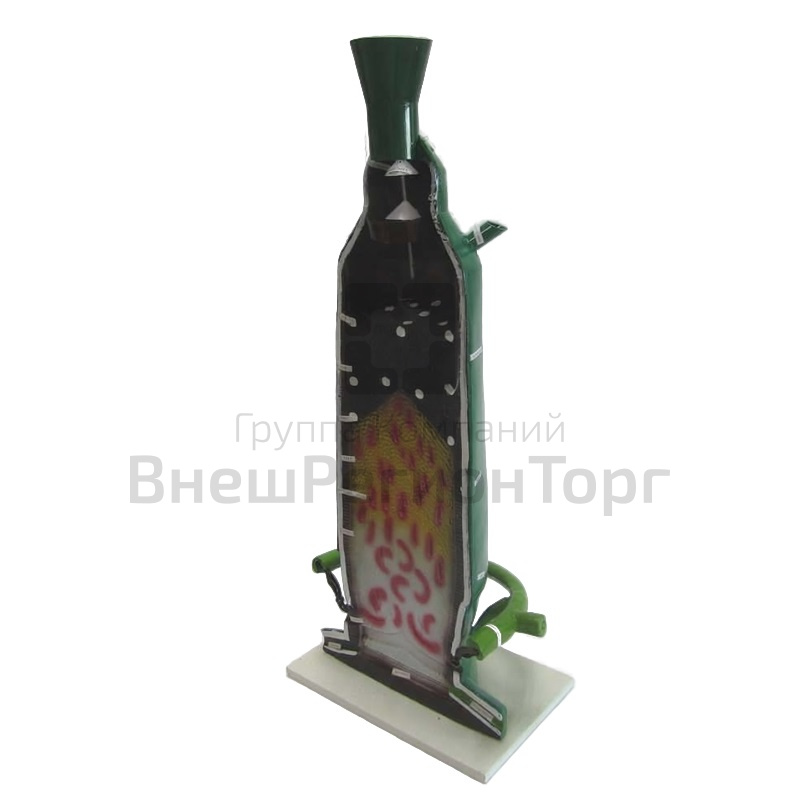 Модель предназначена для использования в общеобразовательных учреждениях на уроках химии, при изучении металлов и их сплавов, как демонстрационное пособие. Модель представляет собой уменьшенный прототип доменной печи, выполненный из пластмассы. Позволяет рассмотреть особенности внешнего и внутреннего строения домны, выделить ее составные части: колошник, шахту, распар, заплечики, горн. На внутреннем разрезе печи выделены зоны выплавки чугуна.