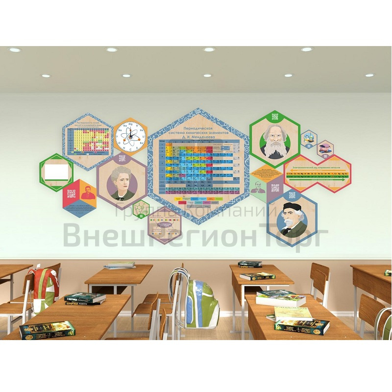 Образовательные панели для оформления стен школьных учреждений. Выполняют две функции: декор и соответствующее предмету обучение. Комплект состоит из набора гексагонов различного размера, которые можно комбинировать, исходя из вашего желания и конфигурации стен. Можно составить оригинальный дизайн, сочетая все шестигранники, а можно повесить их по отдельности.