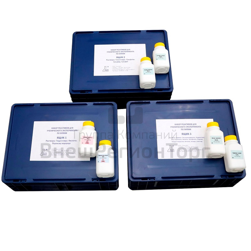 Набор реактивов рассчитан на использование в 8-9 классах (по 30 учащихся в каждом классе) на 1 учебный год. Включает 65 наименований готовых к использованию реактивов, в т.ч. 46 растворов (5 кислот, 2 гидроксида, 35 солей, 3 индикатора, пероксид водорода) и 19 кристаллических веществ (5 металлов, 5 оксидов металлов, 7 солей, 1 гидроксид, крахмал). Общее количество флаконов в наборе - 87, в т.ч. 66 флаконов по 250 мл и 21 флакон по 50 мл. Часто используемые реактивы (кислоты, щелочи и др.) размещены в нескольких флаконах.