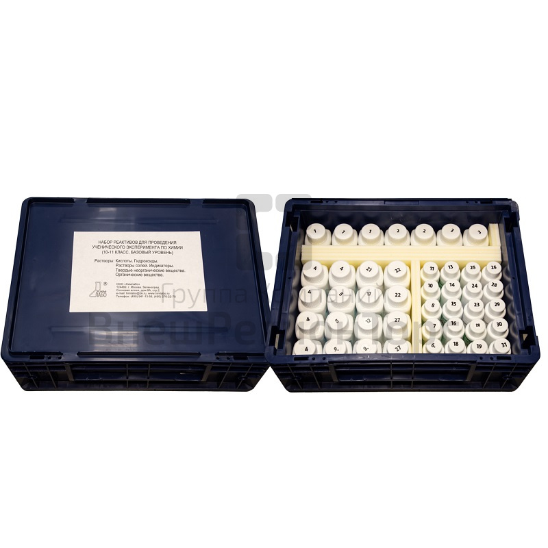 Включает 31 готовых к использованию реактивов, в т.ч. (3 кислоты, 2 гидроксида, 11 солей, 2 индикатора, раствор аммиака) , а так же органические и неорганические вещества, которые используются в лабораторной практикуме по химии на базовом уровне в 10-11 классах.