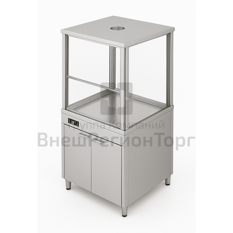 Передняя панель снабжена, электрическими розетками степени защиты IP 54. 2 распашные двери из ЛДСП открывают доступ к сервисному отделению для обслуживания коммуникаций, которые расположены в рабочем отделении шкафа. В верхней части -хим.стойкая столешница, в которую установлена мойка, изготовленная из полиуретана, и смеситель. Верхняя часть шкафа со стеклянными стенками из органического стекла толщиной не менее 3 мм, которые крепятся к металлическому каркасу, имеет в передней части дверь из оргсекла в алюминиевом профиле поднимающуюся вверх при помощи специального механизма. Дверь может фиксироватся в любом положении.
