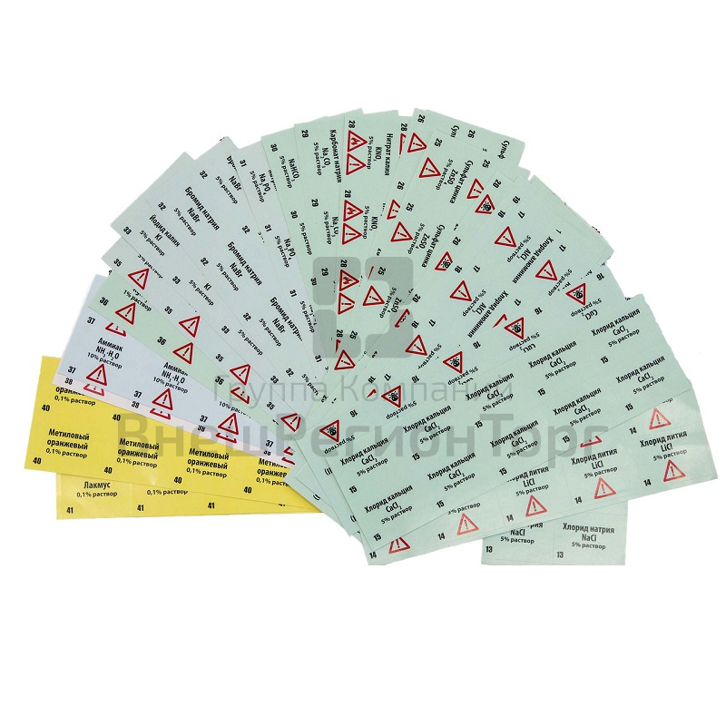 Всего не менее 40 этикеток веществ, каждый вид не менее 10 шт. На каждой этикетке нанесены: название реактива, химическая формула, концентрация (для растворов), знаки безопасности.