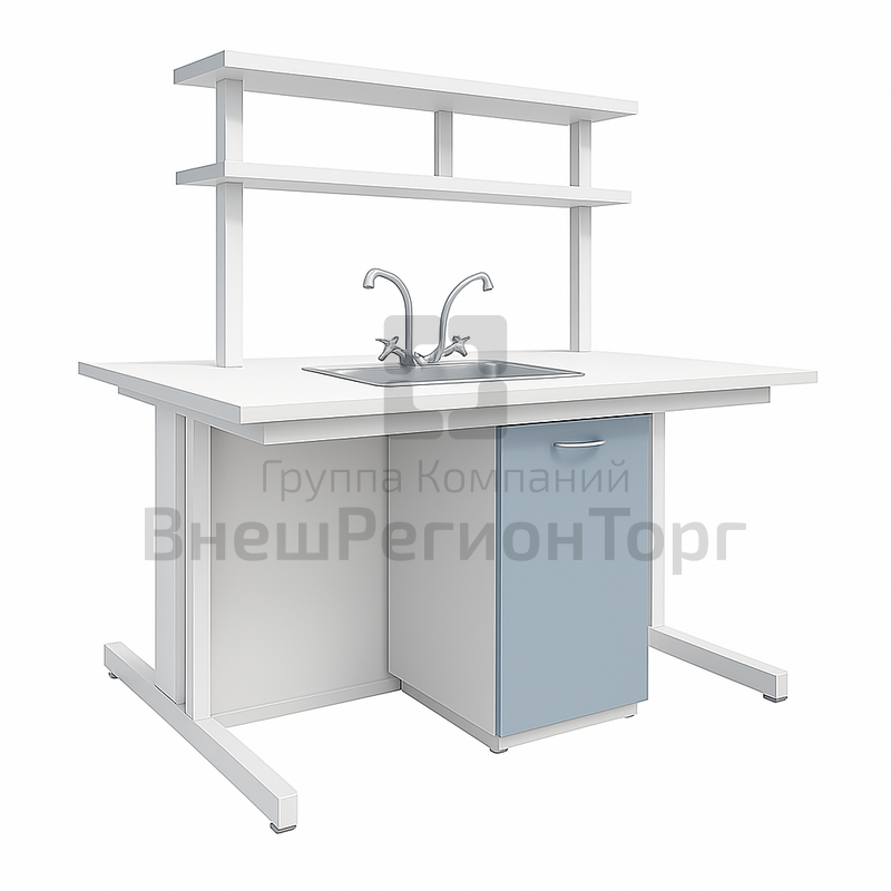 Столешница стола изготовлена из ЛДСП с покрытием хим. стойким HPL толщиной не более 18 мм. Кромка выполнена из специального химически стойкого материала шириной не менее 12 мм. В центральной части стола располагается мойка, изготовленная из Полиуретана, размер мойки не менее 240х140х140 мм., к мойке осуществляется подвод воды через смеситель, который находится непосредственно вблизи самой мойки.