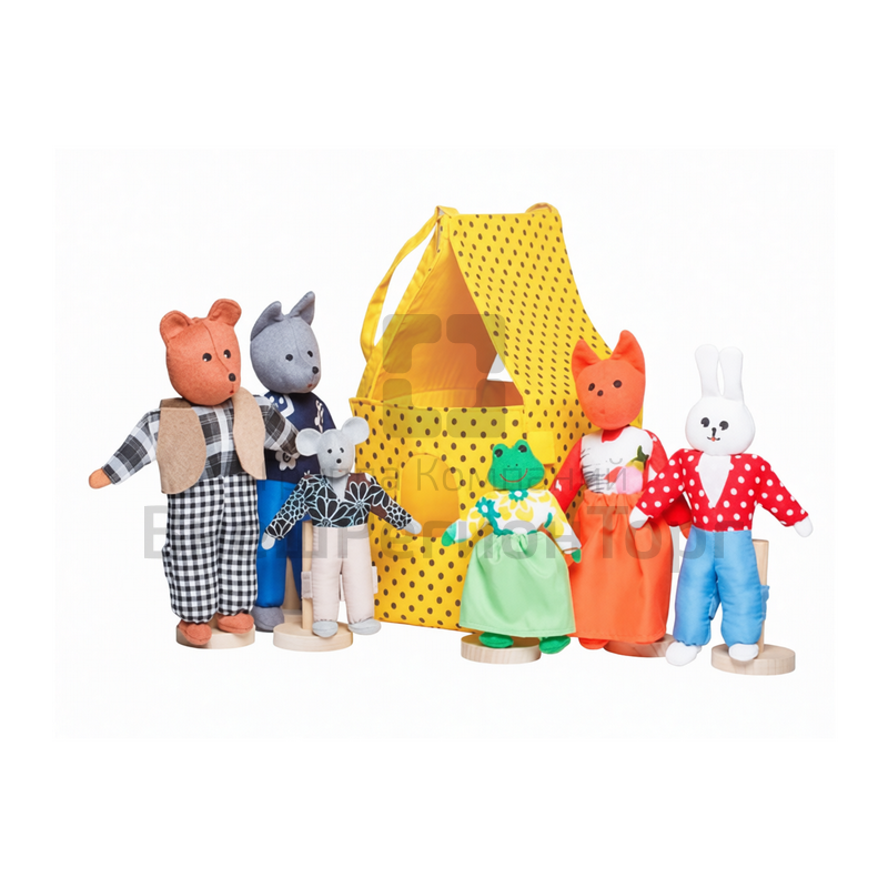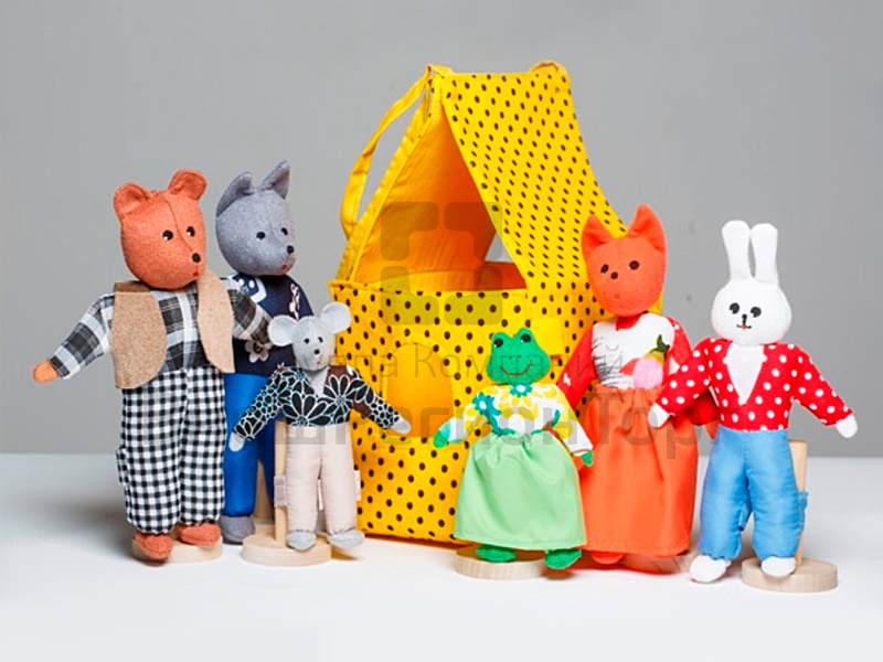В наборе: медведь, волк, лиса, заяц, мышка, лягушка, домик-упаковки 27х15х15 см.