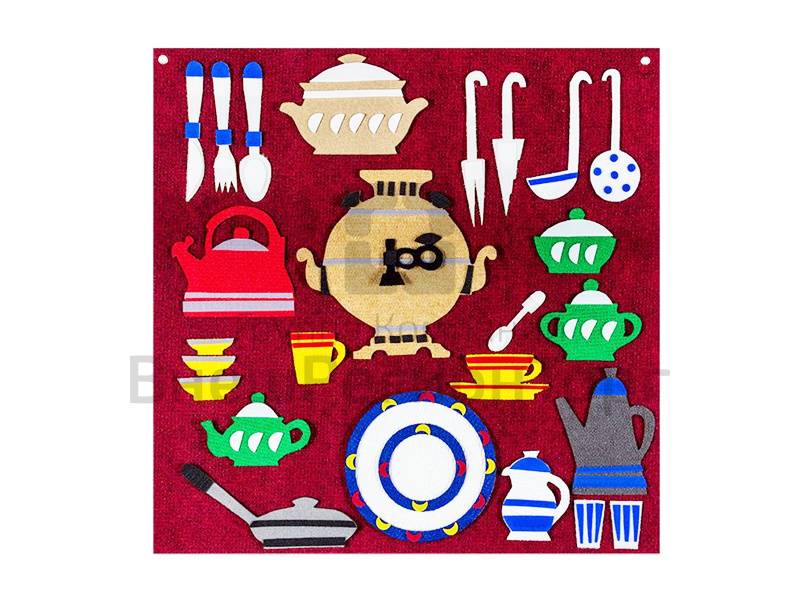 В наборе: игровое поле, ложка, вилка, нож, шумовка, поварёшка, лопатка, кастрюля, самовар, сахарница, чайник заварочный, чайник, кружка, кувшин, тарелк, сковорода, стакан - 2 шт., блюдце.
