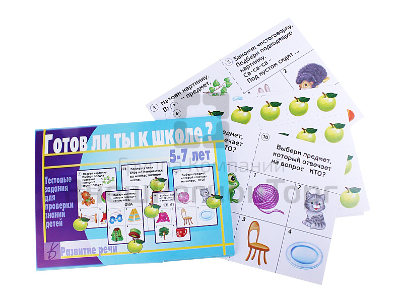 Ребенок не только проверяет свои знания, но и развивает логическое мышление, память, внимание. Пополняет словарный запас и расширяет кругозор. В этом наборе 24 теста, с которыми дошколята проверяют свою логику и знания языка (род, число, падеж существительных, названия предметов и так далее). Перед началом игры разрежьте карты по пунктирным и сплошным линиям, у вас получится 24 карточки с заданиями и 24 маленькие карточки с картинками. Карточки с заданиями предлагаются ребенку по одной. Прочитайте ребенку задание, предложите выбрать правильный ответ из четырех предложенных вариантов. Сравните ответ ребенка с правильными ответами, если они совпали, дайте малышу карточку с картинкой.