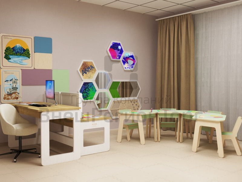 Наглядность и визуализация. При оснащении кабинета логопеда и психолога-дефектолога оборудованием «АЛМА» наши дизайнеры-визуализаторы могут сделать индивидуальную расстановку мебели, исходя из размеров и особенностей комнаты. Вы получаете наглядное представление о внешнем виде помещения и его зонировании, и сможете скорректировать детали в случае надобности.