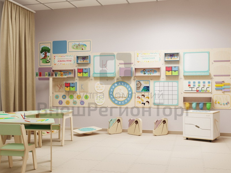 Зонирование и функциональность. На основе требований Государственного Стандарта наши методисты создали универсальную комплектацию для кабинета психолога и логопеда – это мобильная, многофункциональная предметно-развивающая среда, в которой все дидактические и коррекционные инструменты, входящие в комплект, вариативны в использовании для разных возрастов ребёнка и задач обучения.
