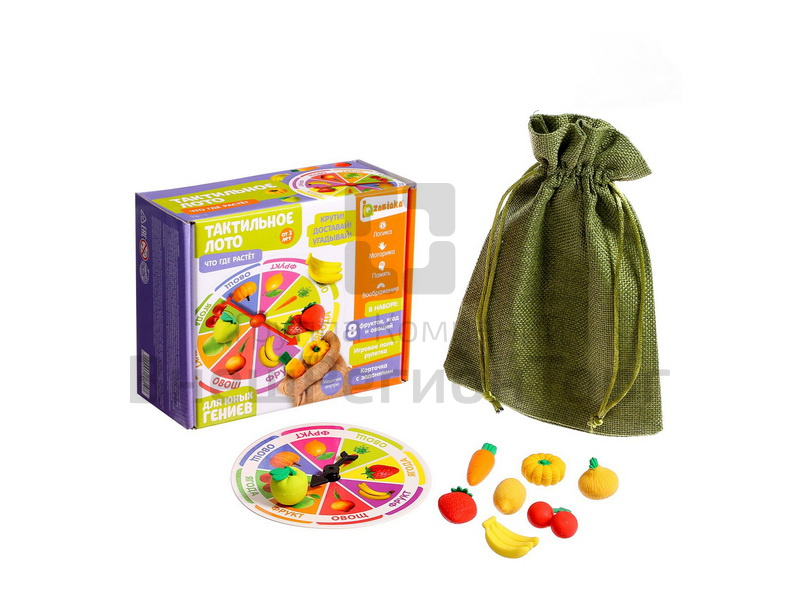 Все фрукты, ягоды и овощи выполнены из мягкой резины, приятны на ощупь и безопасны для здоровья! Тактильное лото «Что где растёт» рекомендовано детям старше 3 лет.