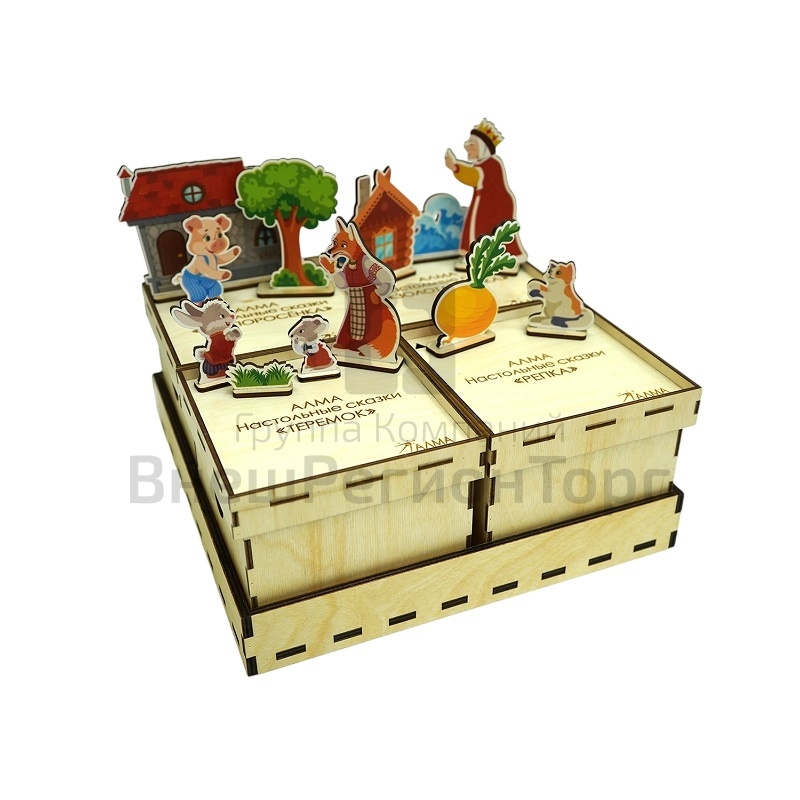 Настольный театр, который не только развлекает, но и способствует развитию памяти, внимания и концентрации у детей, а также знакомит с сюжетами всемирно известных сказок. В наборе четыре коробки и подставка, обратная сторона которой является игровым полем. В каждой коробке лежат фигурки персонажей и атрибутов из соответствующей сказки. На крышке каждой коробки находится своя фигура, которая продублирована на подставке персонажей этой истории: данная система не позволит случайно перепутать героев и их сказки. Комплект изготовлен из экологичных материалов, безопасных для использования детьми. Соответствует требованиям СанПиН, ФГОС, ФОП и пожарной безопасности.