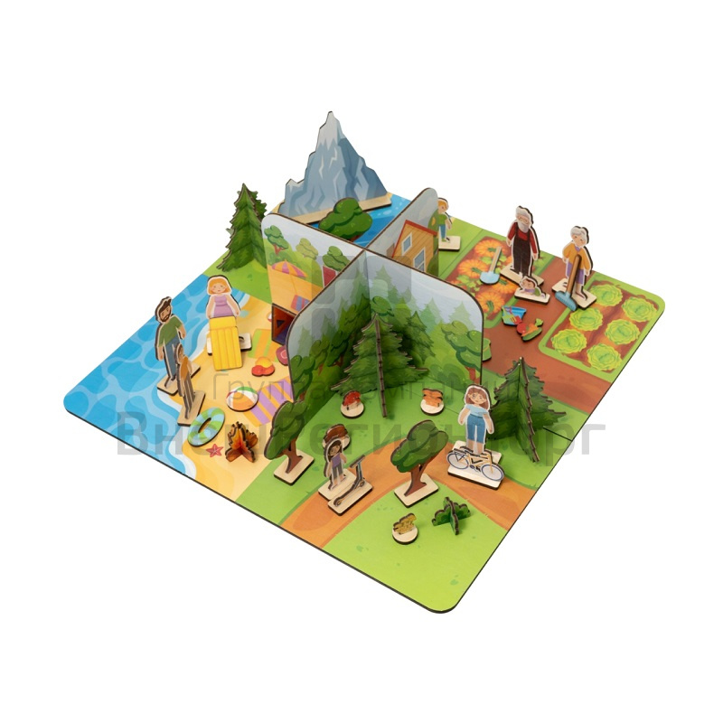 - Набор персонажей для игры: 7 членов семьи (папа, мама, 3 детей разного возраста и пола, дедушка, бабушка) и 5 дополнительных персонажей (полицейский, тренер, продавец, женщина, мальчик – комплектация зависит от типа локации).