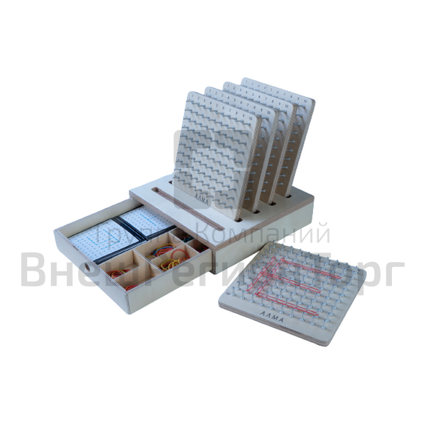 Математический комплекс состоит из 5 геобордов, включая карточки с заданиями, методические рекомендации, набор цветных резинок.