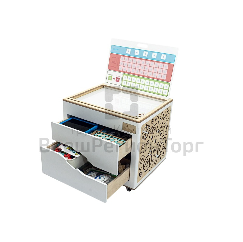 Мобильный куб с выкатными ящиками плавного хода, функциональными боковинами и верхней крышкой. Его можно передвигать в любое место, где ребёнку будет удобно заниматься.