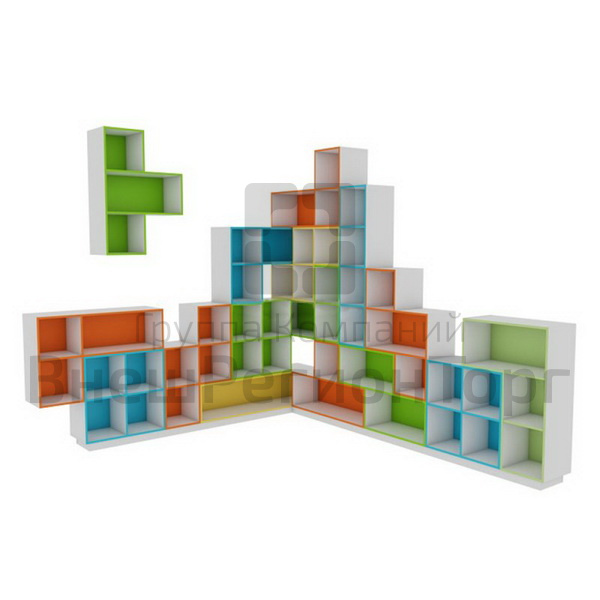 Стеллаж Тетрис станет удобным предметом интерьера в детском саду. Благодаря модульной конструкции можно составить стеллаж любых размеров и любой формы. Элементы можно поставить на колеса или повесить на стену. Модель предлагается в готовых 4 комплектах или отдельными элементами.