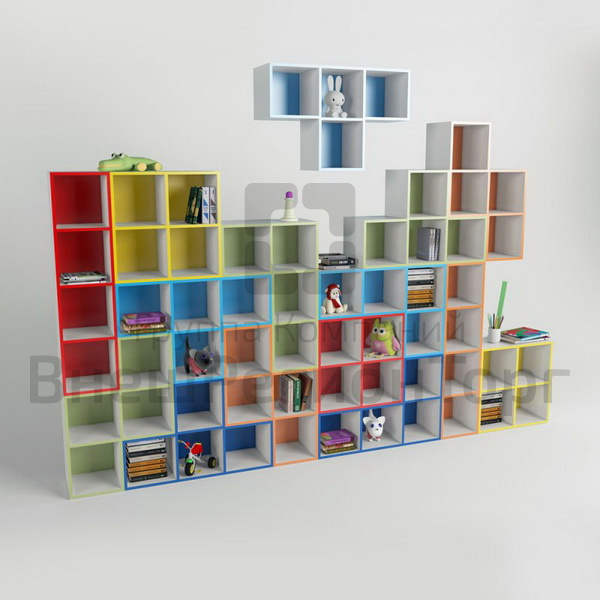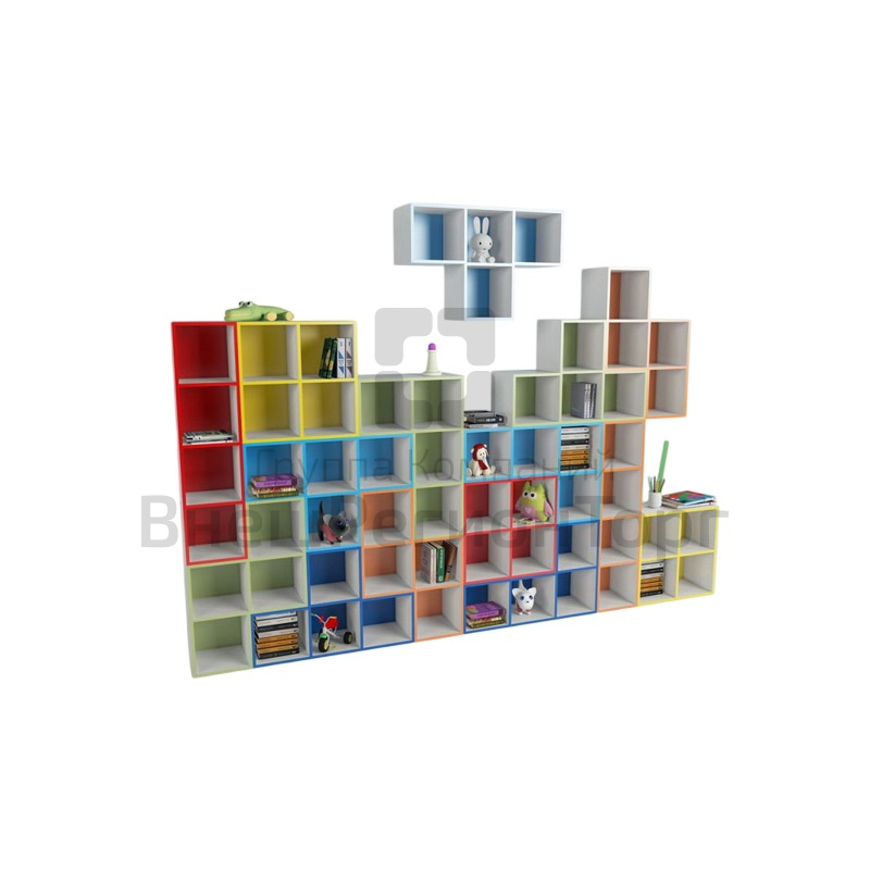 Стеллаж Тетрис станет удобным предметом интерьера в детском саду. Благодаря модульной конструкции можно составить стеллаж любых размеров и любой формы. Элементы можно поставить на колеса или повесить на стену. Модель предлагается в готовых 4 комплектах или отдельными элементами.