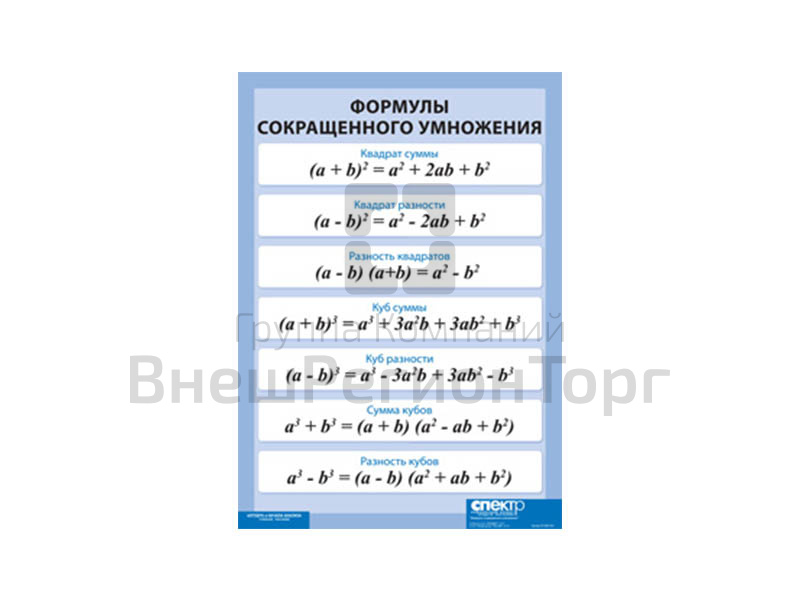 У нас вы можете купить Таблица Формулы сокращенного умножения (винил), сравнить цены, получить прайс-лист, получить отзывы реальных покупателей. Мы соответствуем требованиям ФГОС, ГОСТ и СанПиН. Мы работаем на основании федеральных законов No44-ФЗ и No223-ФЗ.