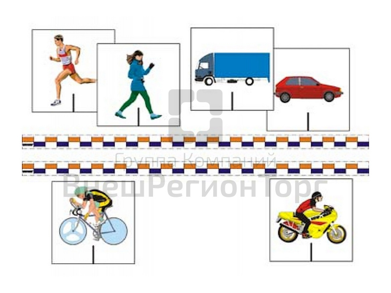 Пособие крепится на классную доску магнитными кнопками. Карточки с изображениями людей и транспортных средств также снабжены магнитами, что позволяет легко крепить их и передвигать по доске. На лицевой стороне карточки нанесена прямая, предназначенная для совмещения со штрихами разметки.