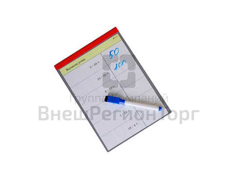 На лицевой стороне планшета закреплена пленка, под которую может помещаться карточка с заданиями. Ответы записываются на пленке маркером на водной основе. Надписи можно стирать специальным ластиком, закрепленным в колпачке.
