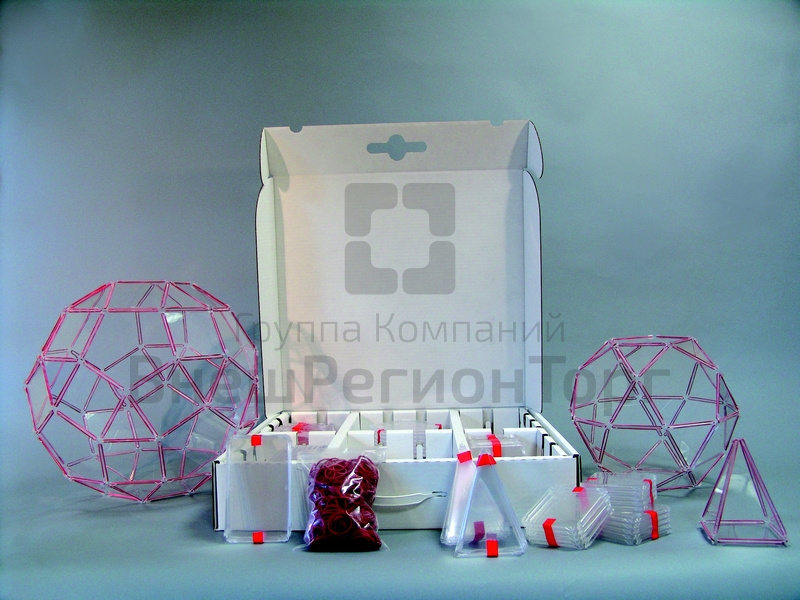 Всего 286 элементов, в том числе 100 равносторонних и 60 равнобедренных треугольников, 60 квадратов, 30 прямоугольников, 36 пятиугольников, резиновые кольца для соединения.
