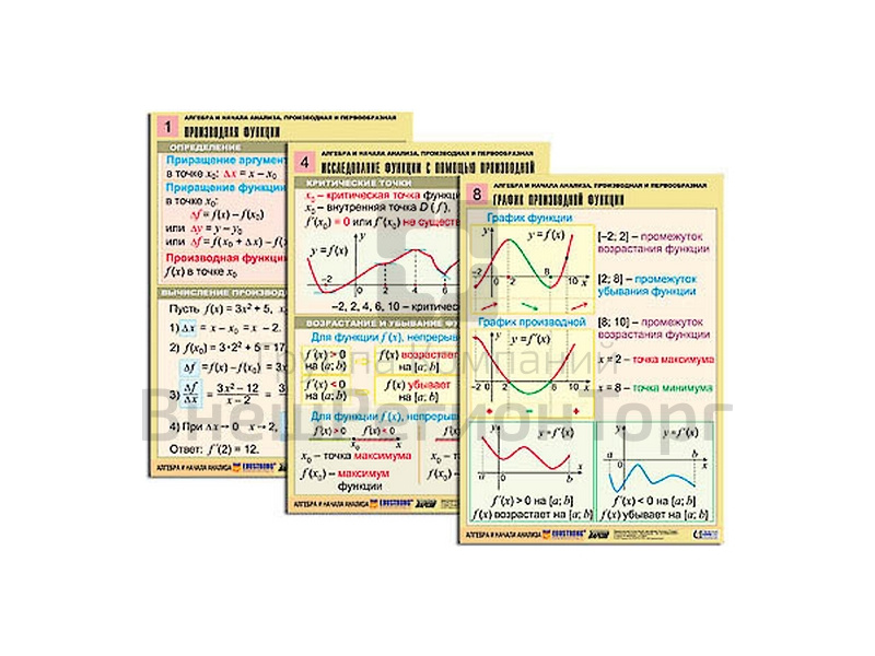 Подробное описание Комплект таблиц Алгебра и начала анализа. Производная и первообразная, 12 таблиц, А1
