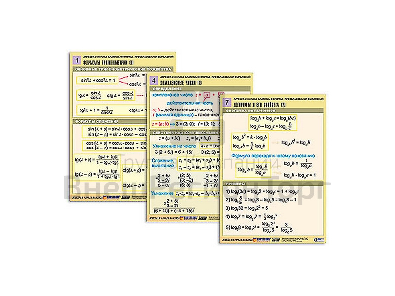 Подробное описание Комплект таблиц Алгебра и начала анализа. Формулы. Преобразования выражений, 8 таблиц, А1