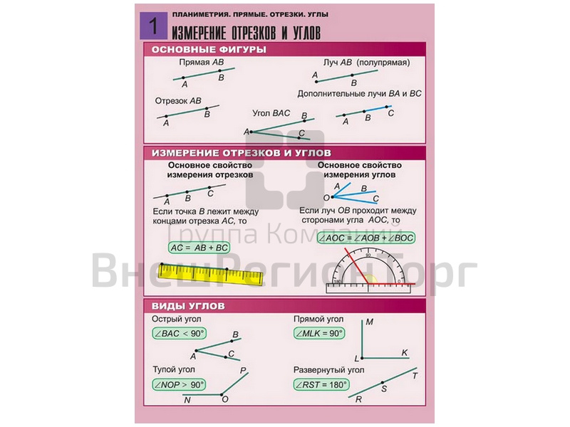 Комплект таблиц по геометрии Планиметрия. Прямые. Отрезки. Углы, 8 таблиц, А1
